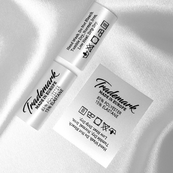 Etiqueta de composición personalizada con nombre de Marca, datos de mantenimiento y lavado, adecuada para ropa y accesorios de vestir. Este modelo de etiqueta textil se fabrica utilizando las tecnologías más avanzadas en el campo de la impresión digital en medios textiles. Las etiquetas están impresas en satén especial, por el método de transferencia térmica, con una calidad de impresión impresionante y alta resistencia al lavado.