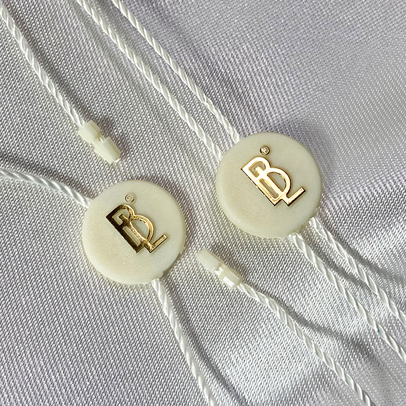 Sello de plástico ST-M35 con forma redonda, muy elegante y bellamente personalizado en dos lados con el nombre o emblema de la marca, adecuado para ropa, zapatos, bolsos, etc. Este modelo de sello está hecho de materiales de alta calidad, utilizando las tecnologías más avanzadas en el campo.